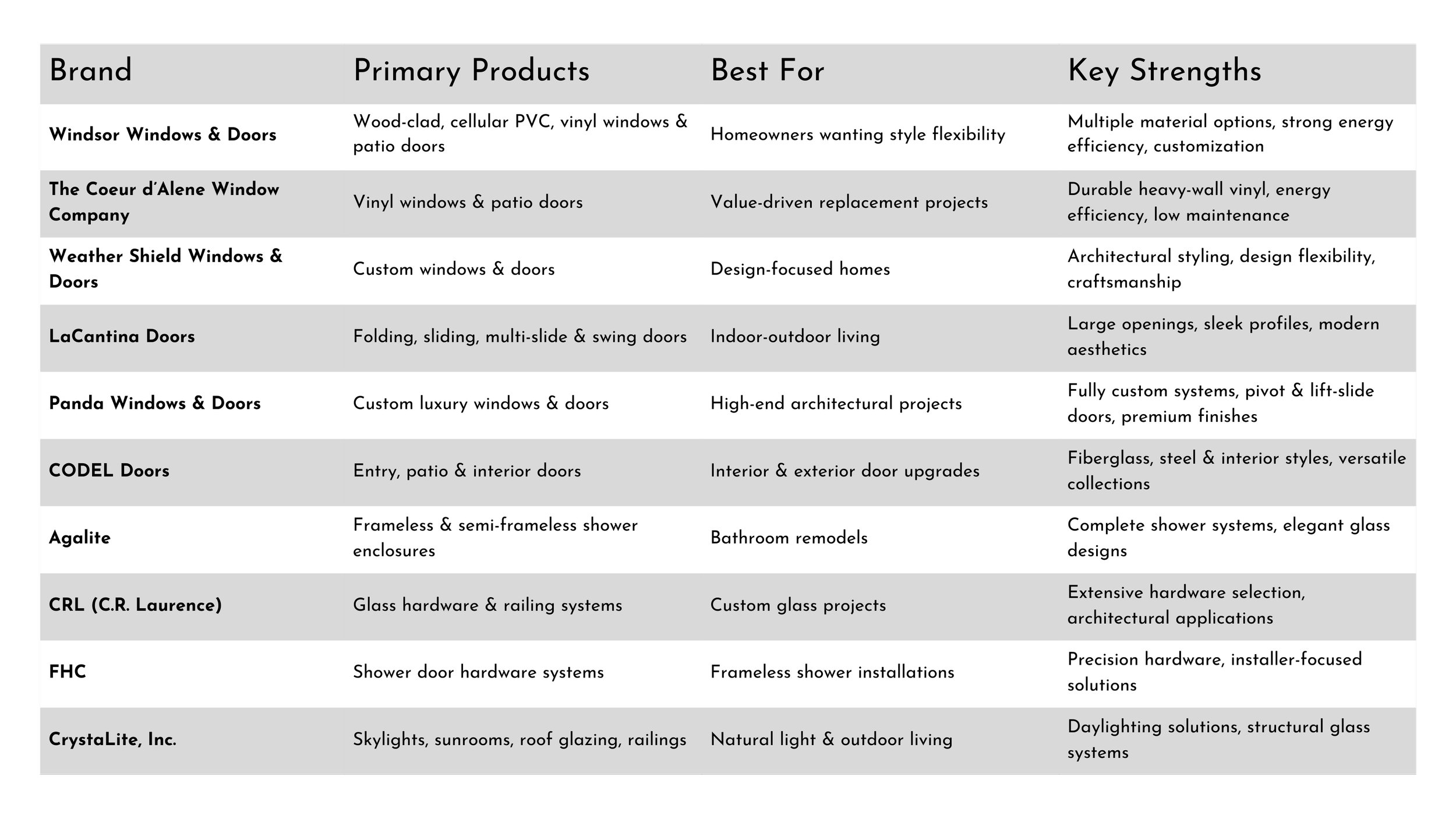 Agalite delivers complete shower enclosure systems, while CRL and FHC support fully custom frameless glass designs.